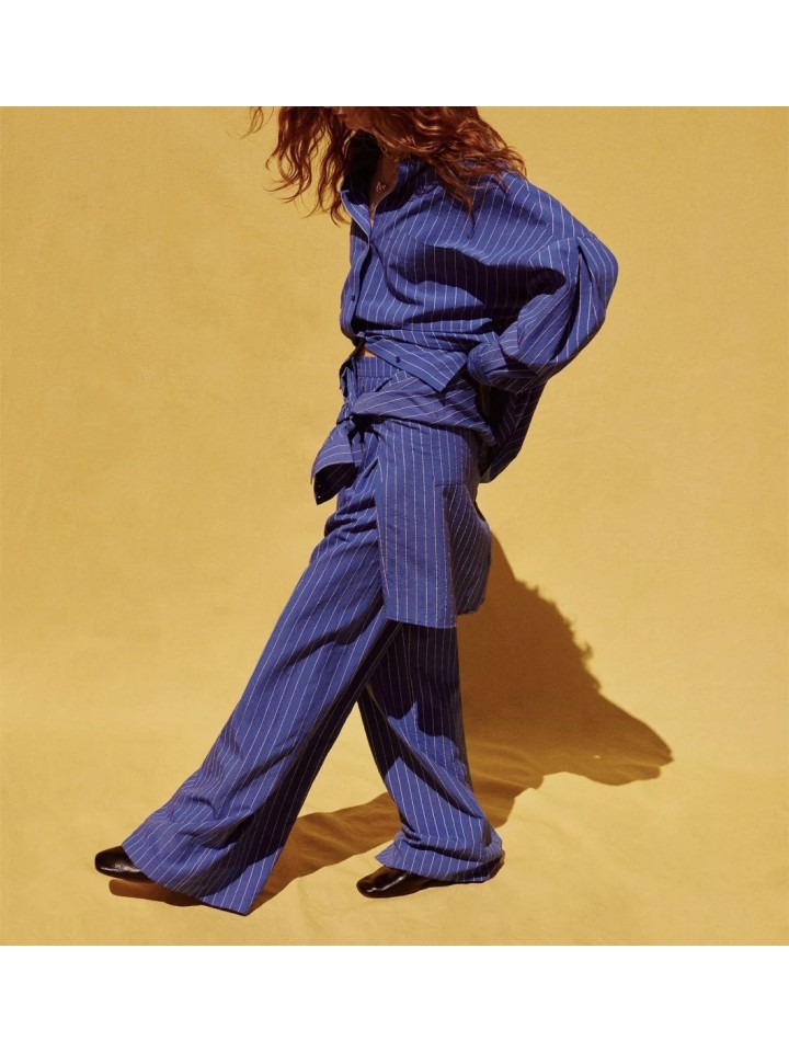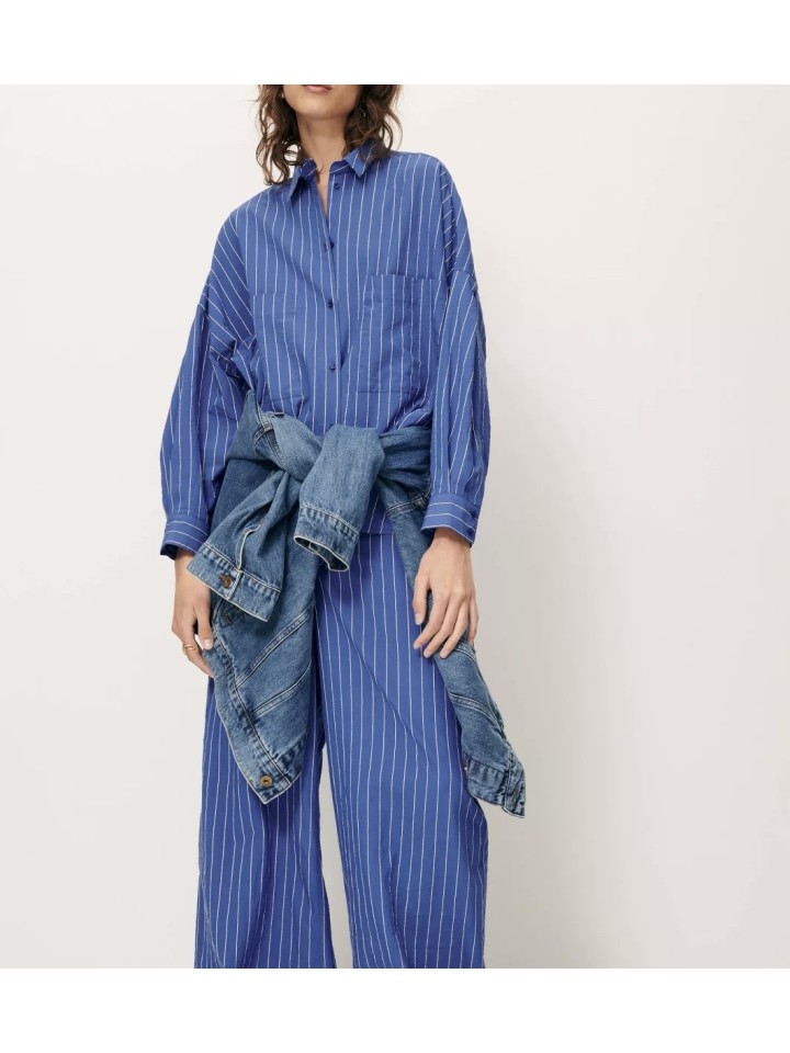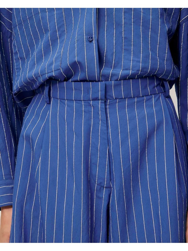 Pantalón amplio en popelín compacto con efecto arrugado y motivo de rayas dobby, tejido en Italia. Talle alto y cierre con cremallera oculta. Bolsillos en las costuras laterales y bolsillos de ojal en la parte trasera.