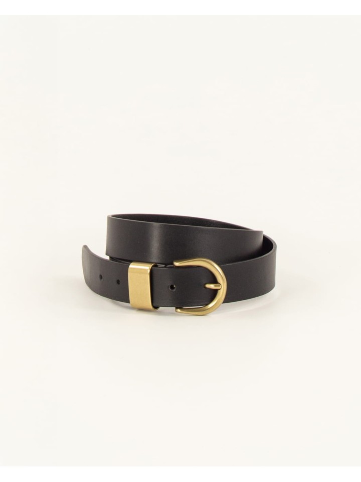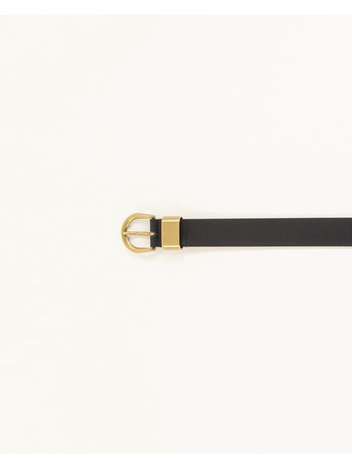 Cinturón en piel de vacuno con hebilla grabada y presilla metálica.
