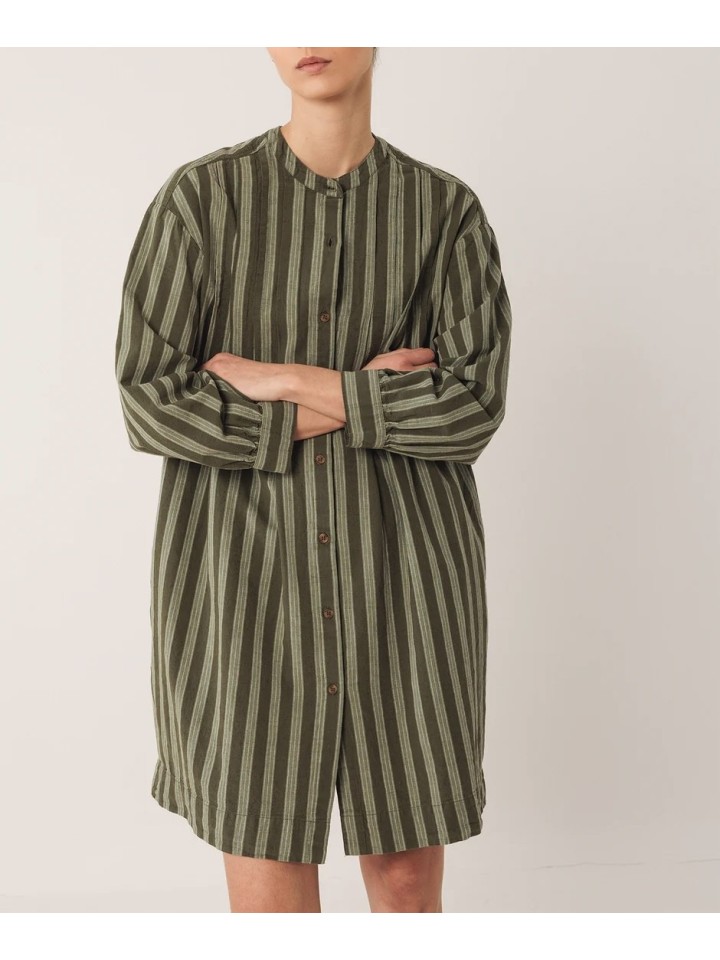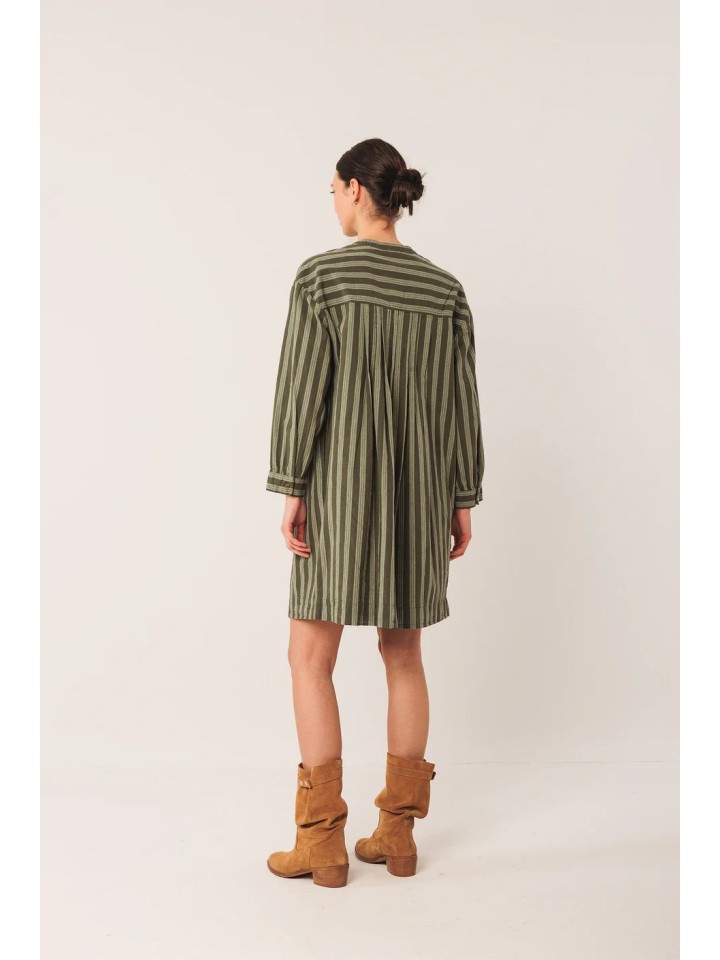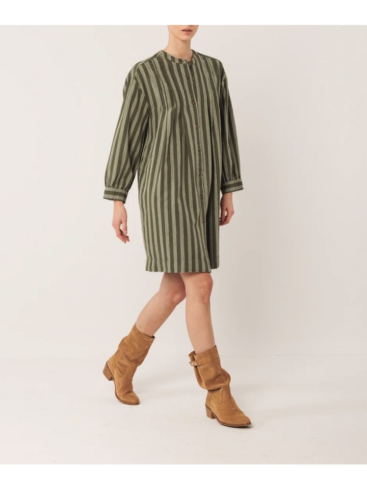 Vestido de cuello redondo y hombre ligeramente caído. Pliegues en la parte frontal y fit oversized.