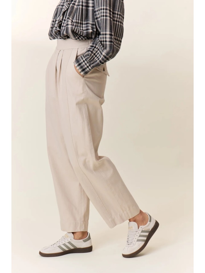 Pantalón largo en loneta de algodón. Cintura con goma en la parte trasera para mejor ajuste.