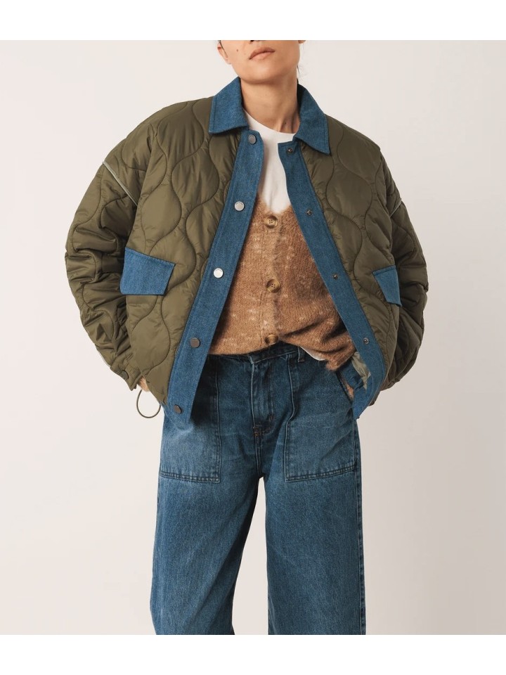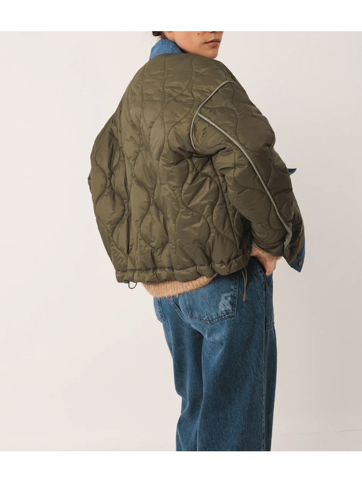 Cazadora corta de inspiración retro con cuerpo acolchado y detalle de cuellos, tapeta y bolsillos en tejido a contraste.