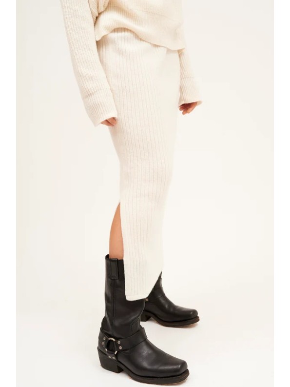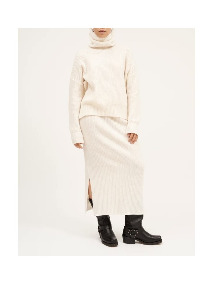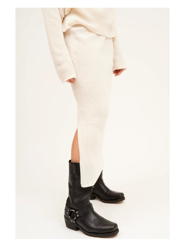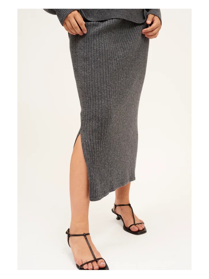 Falda recta de punto acanalado con cinturilla de goma. Abertura lateral desde la rodilla.