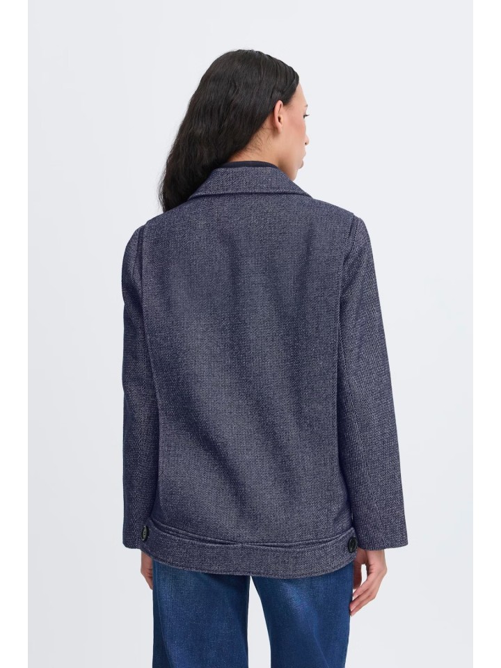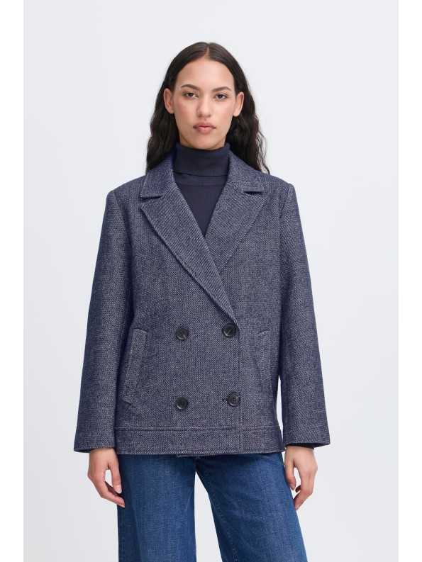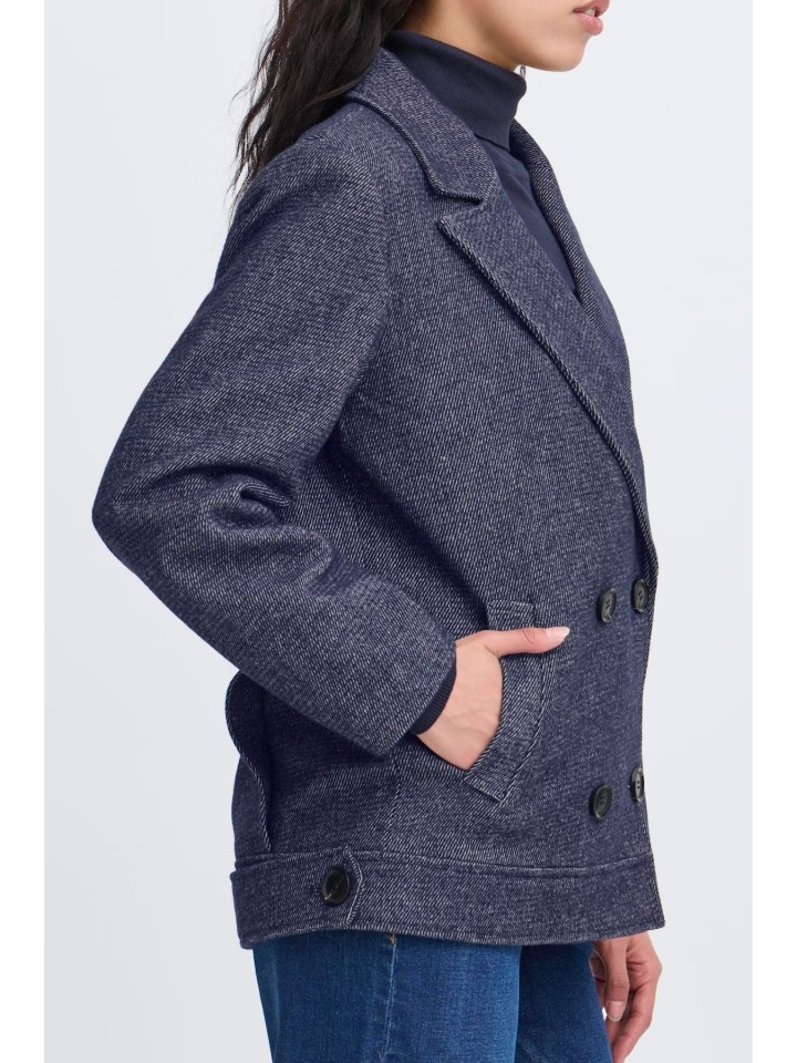Abrigo corto cruzado con doble botonadura y solapas.