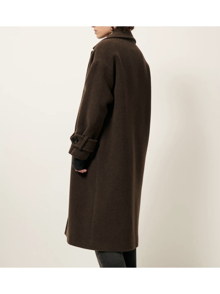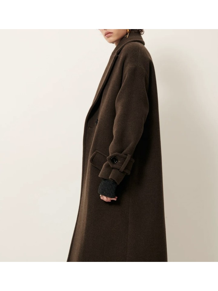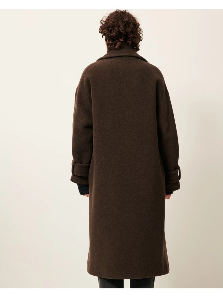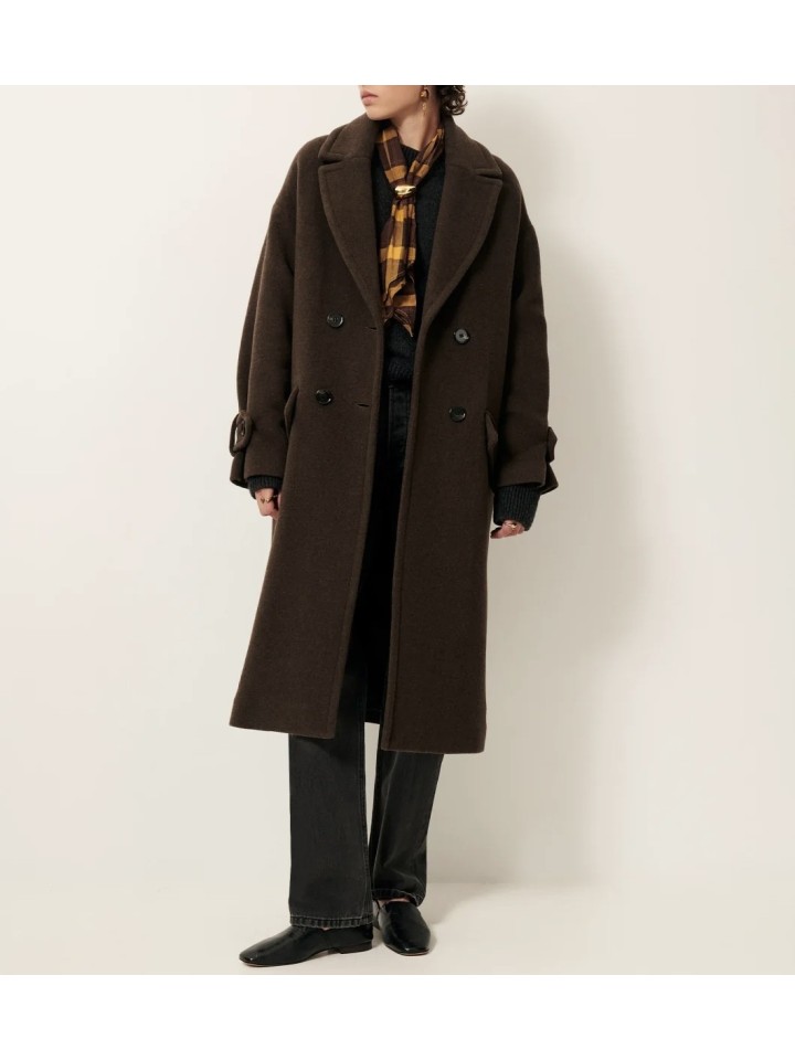Abrigo largo de doble botonadura en doble tejido Melton con acabado aterciopelado.