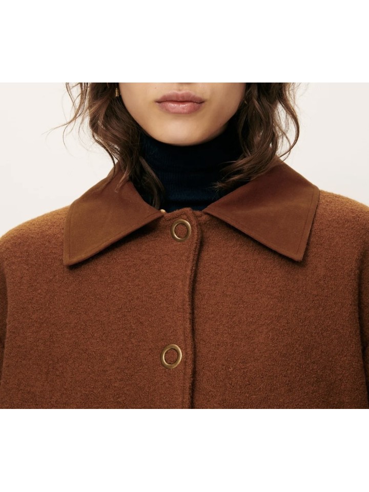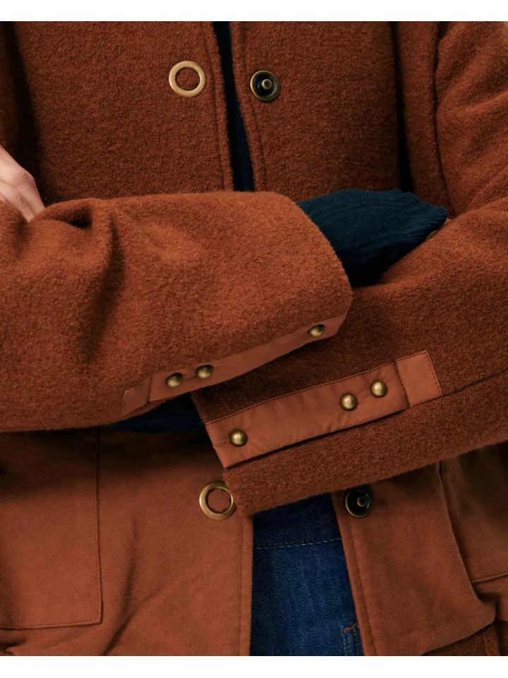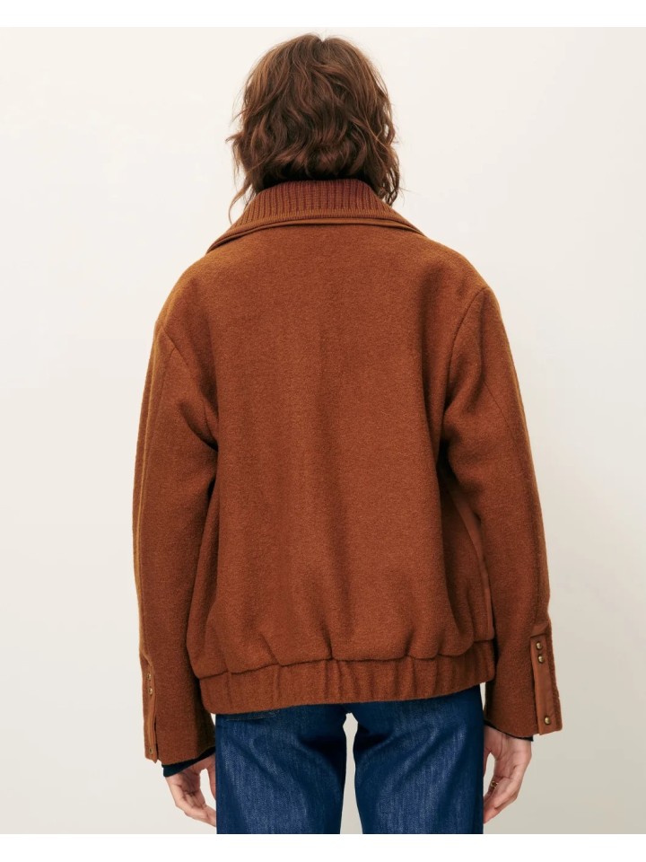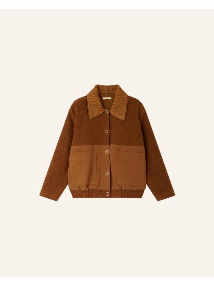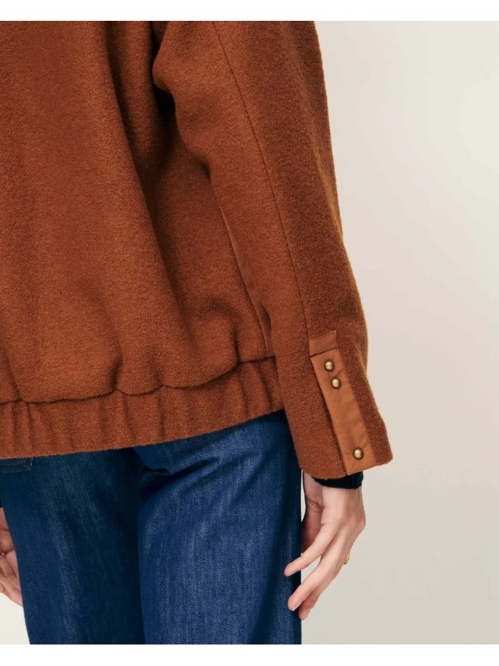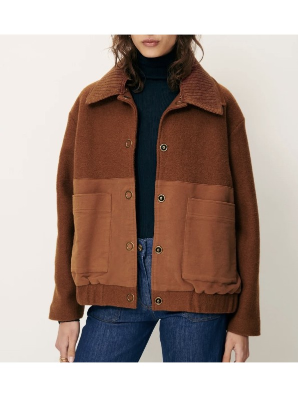Cazadora redondeada y elástica en lana hervida con paneles de sarga en algodón cepillada.