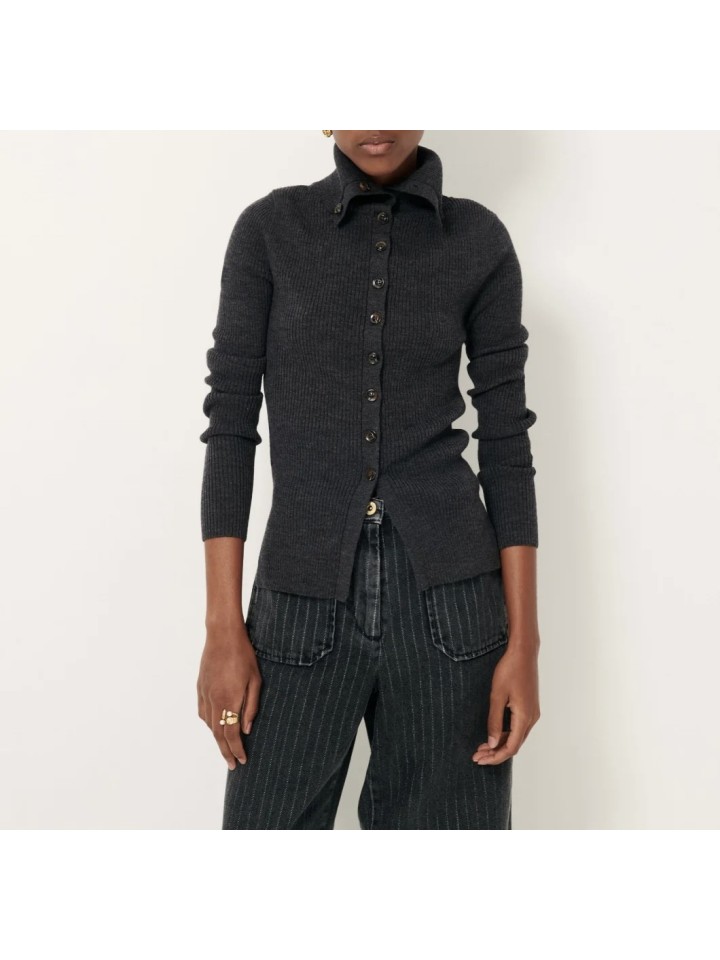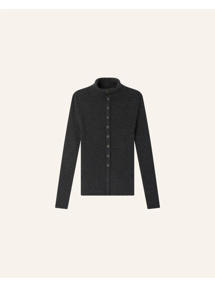Rebeca con cuello alto plegado en punto acanalado de lana merino.