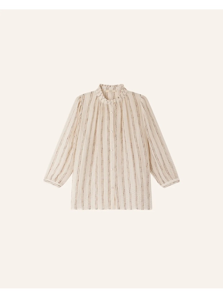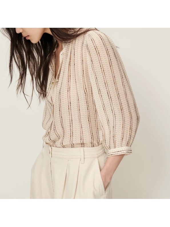 Blusa en crespón de gasa de seda y viscosa estampada con finas rayas metalizadas.