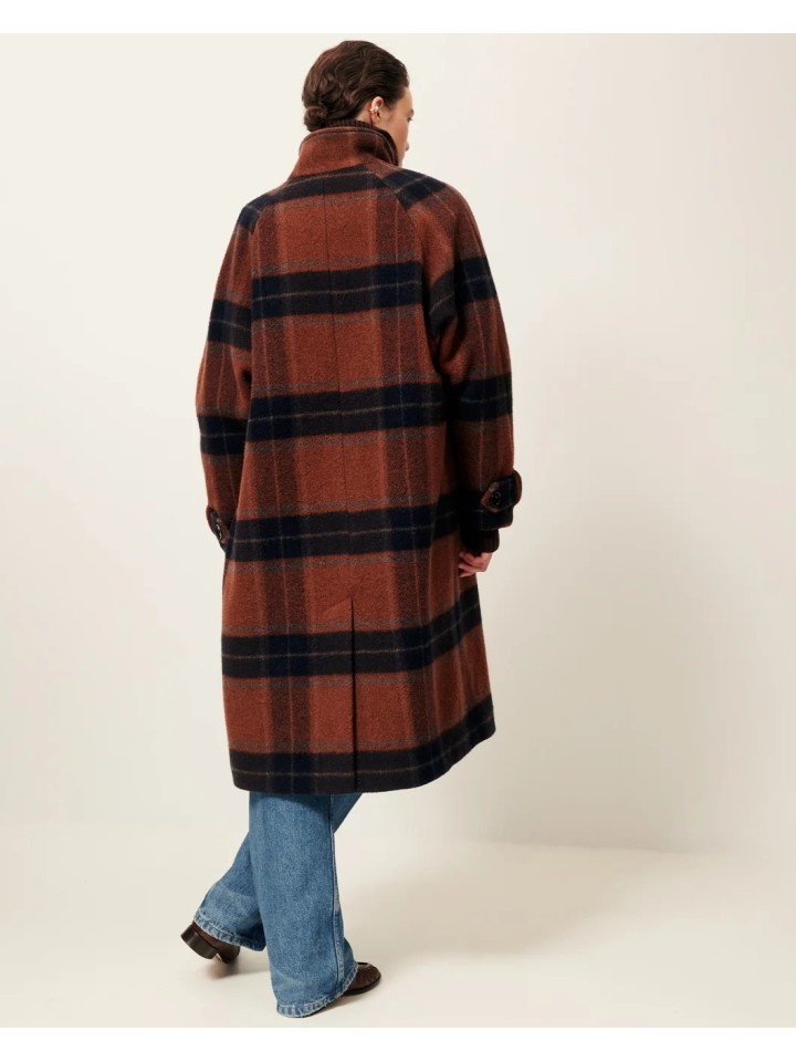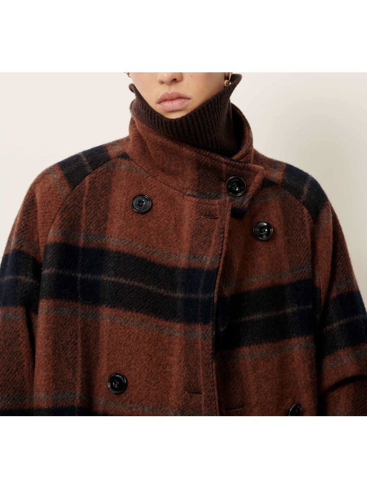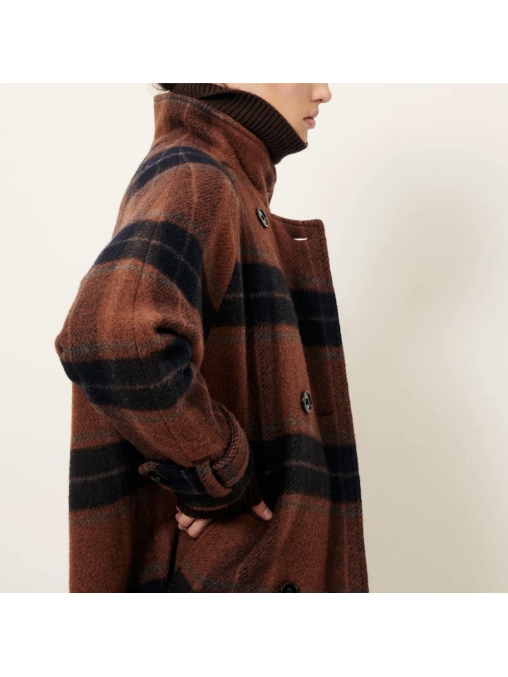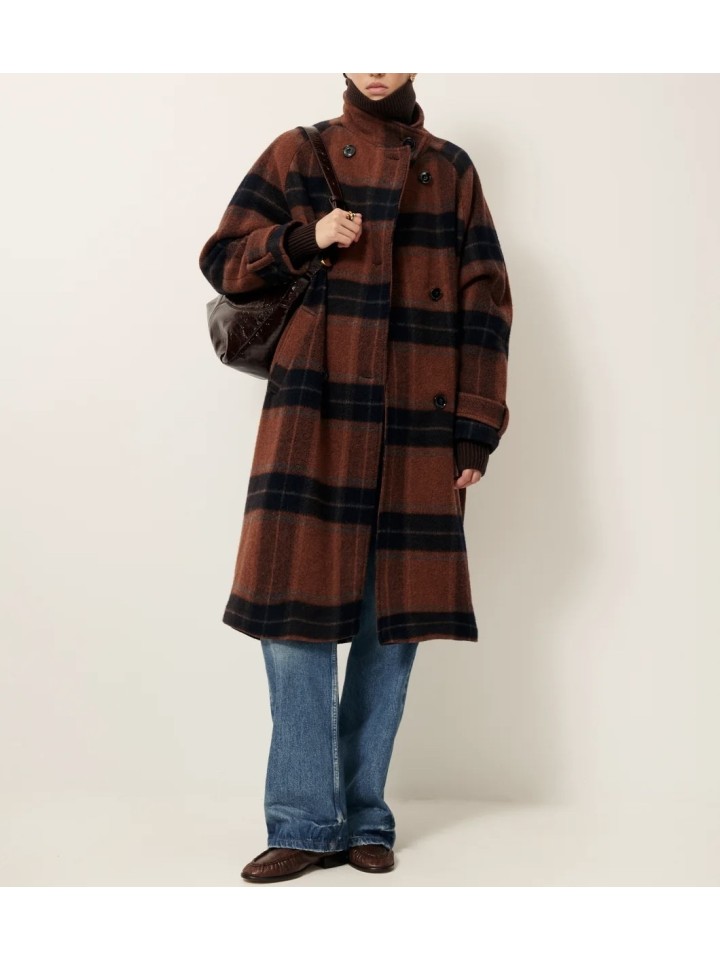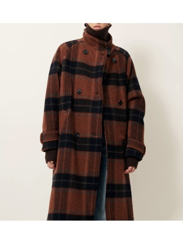 Abrigo largo de doble botonadura en doble tejido de lana con sarga con motivo de cuadros.