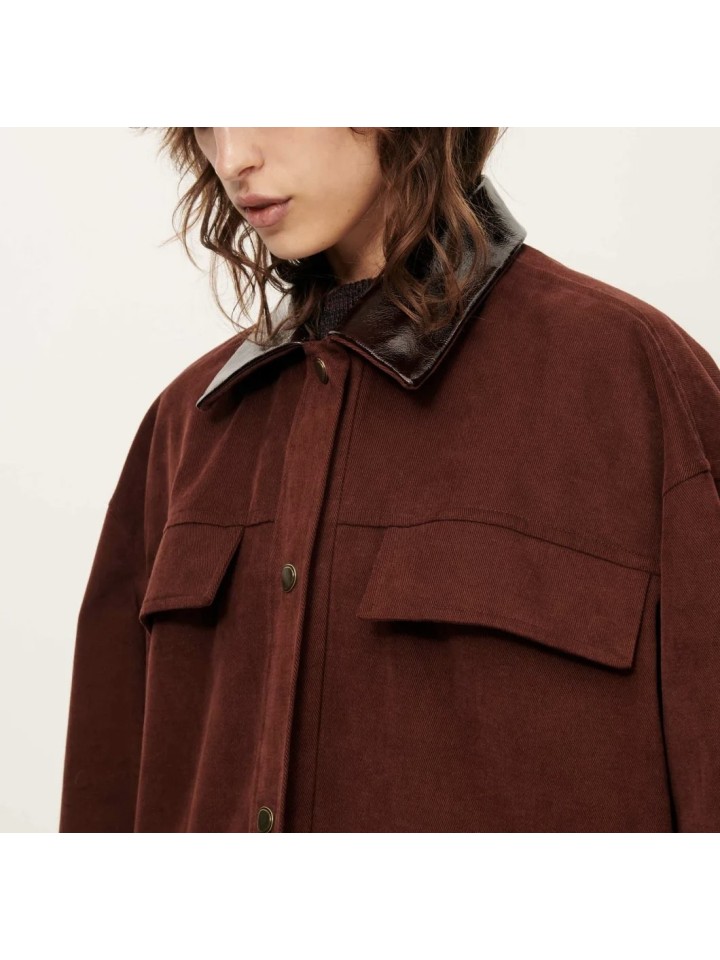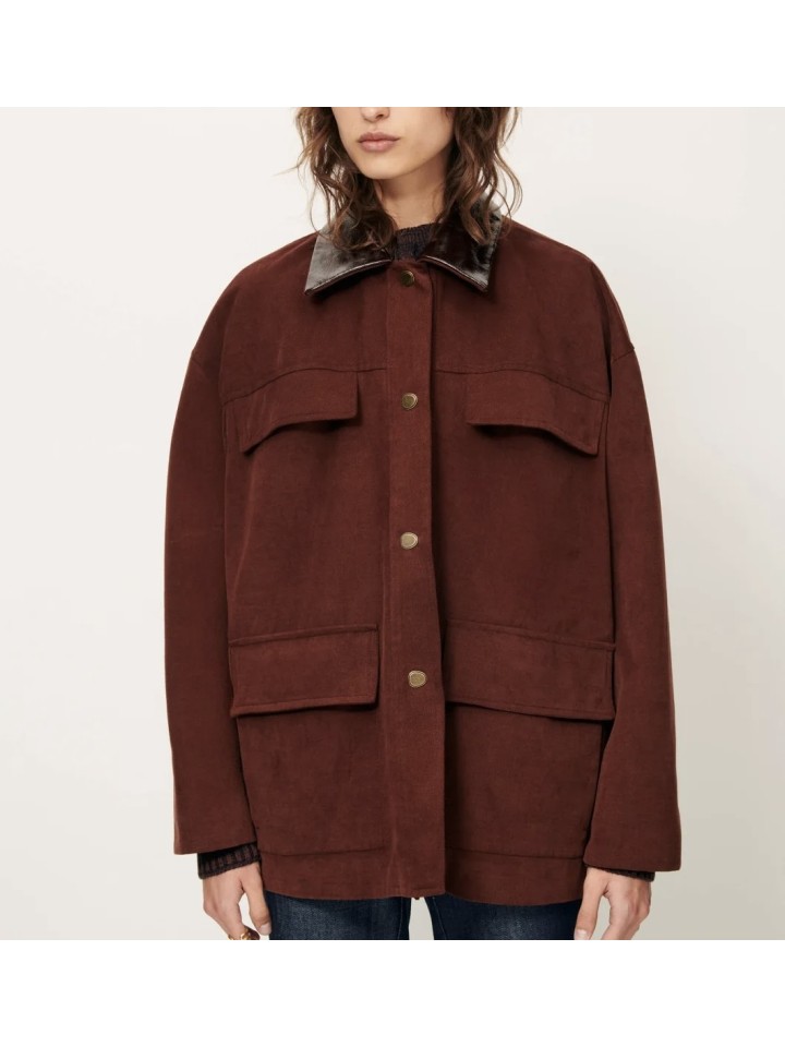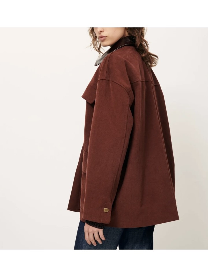 Chaqueta de estilo utilitario en sarga de algodón elástica con acabado aterciopelado, tejida en Italia. Cuello de piel a contraste y bolsillos de parche.