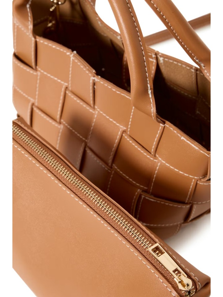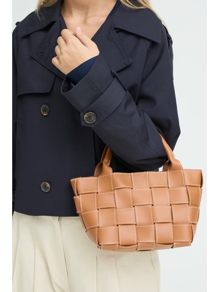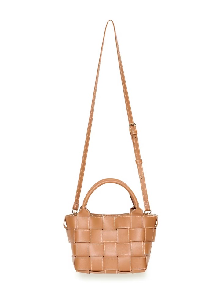 Bolso pequeño tipo capazo con aspecto de piel trenzado. Cartera interior extraíble, asa de mano y correa bandolera.