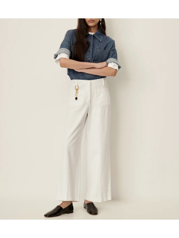 Pantalón capri recto de talle alto. Cierre con botón en la cintura y cremallera oculta. Bolsillos parche delanteros.
