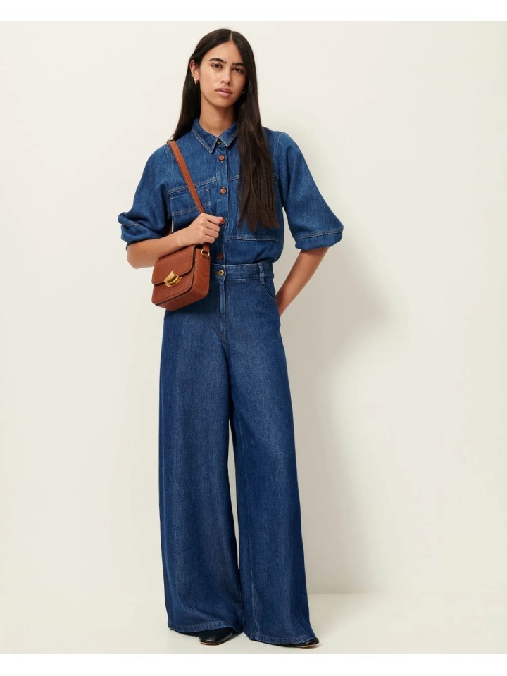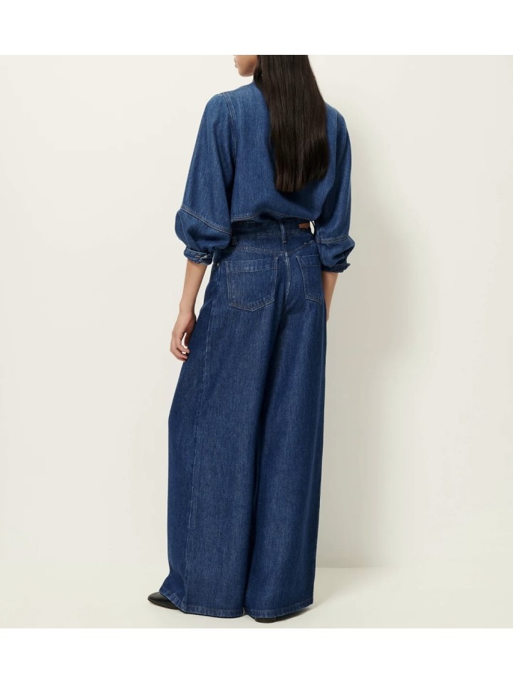 Pantalón vaquero amplio de talle muy alto con pernera ligeramente acampanada.