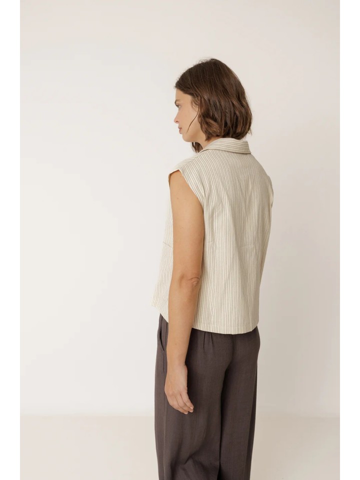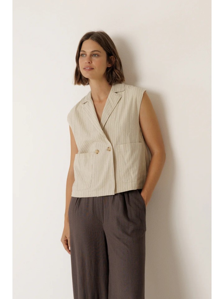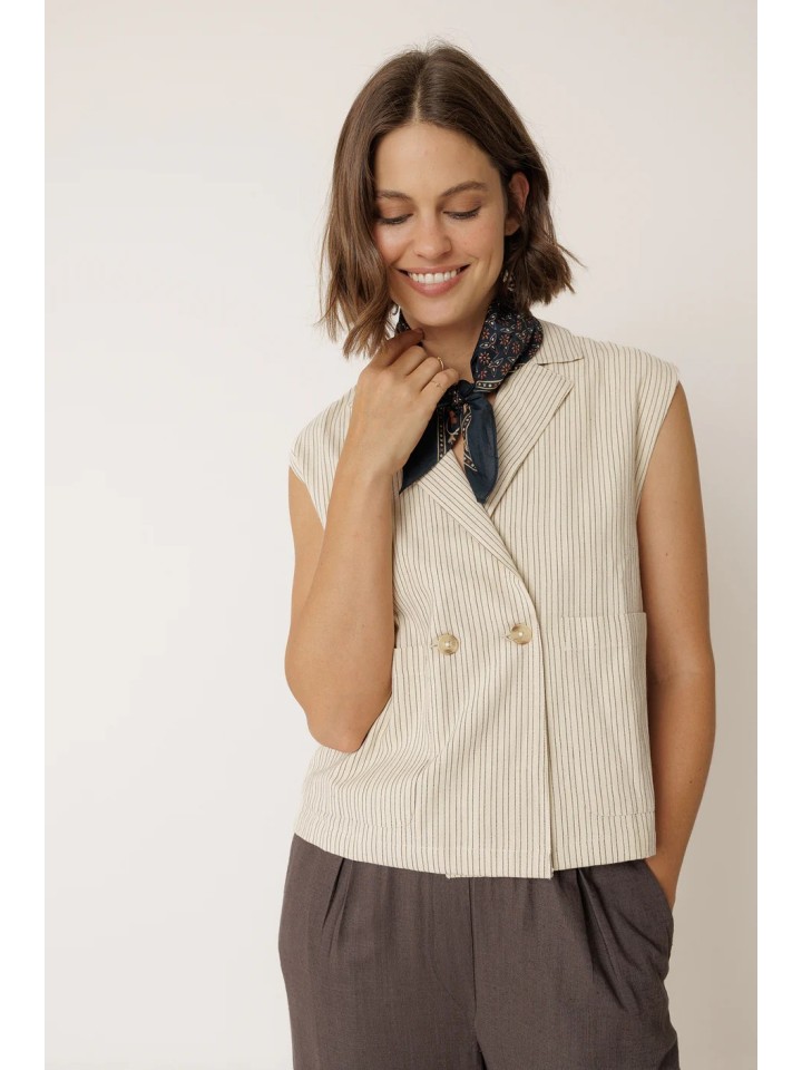 Chaleco con cuello solapa y cierre cruzado.